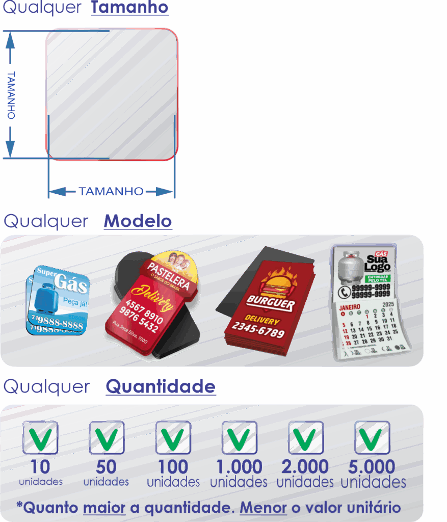 Você tem a opção de configurar seus pedidos da forma que melhor se encaixa as suas necessidades, sendo qualquer tamanho, formato, quantidade, tipo de acabamento ou material.
